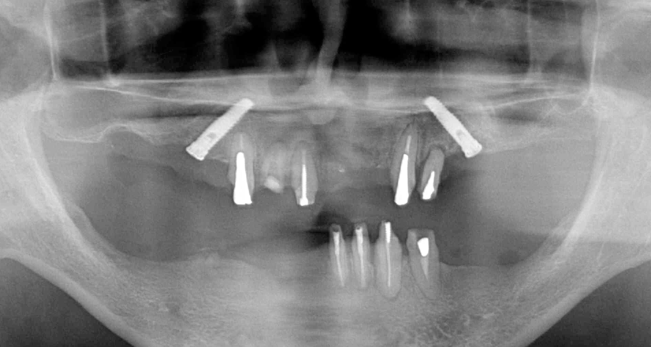 前歯しか残らなかった方です。奥歯にインプラントをしなければならないのですが、普通のインプラント治療であればサイナスリフト(骨移植)して1年待ってそれからインプラントを埋入してと1年半くらいかかってしまいます。ですが、オールオンフォーの治療を行っている医院であればこのような治療を施すことが可能となります。